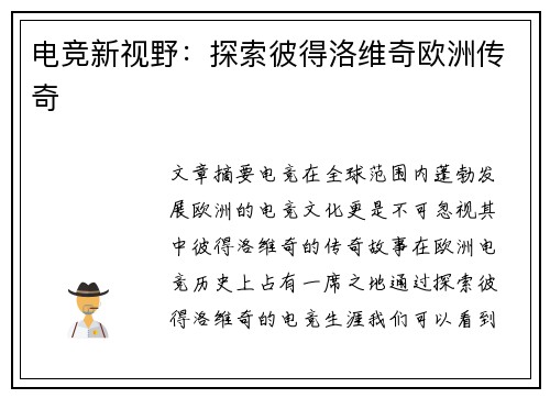 文章摘要:博尔特与弗鲁姆,作为奥运赛场上的两位超级巨星,他们的传奇故事已成为体育界的经典传奇。从闪电般的短跑到无与伦比的自行车赛场,他们的成就不仅令人瞩目,更将其运动生涯推向了新的巅峰。本文将从博尔特与弗鲁姆的职业成就、他们面对的挑战、以及他们如何克服这些挑战三个方面,探讨这两位运动员的传奇征途,并分析他们如何在全球舞台上再启新篇。最后,本文将总结他们的成就如何影响了现代体育界,展望他们未来可能的...